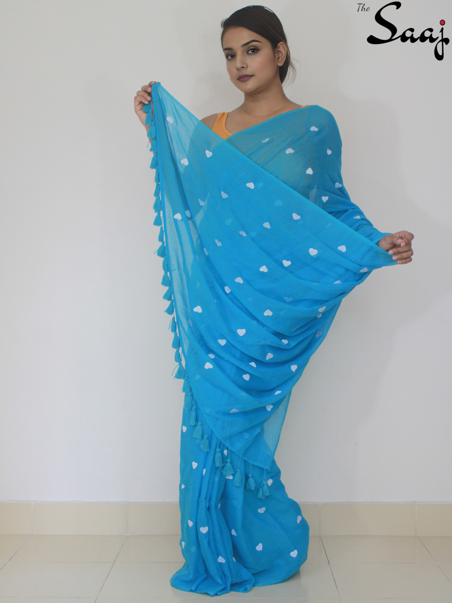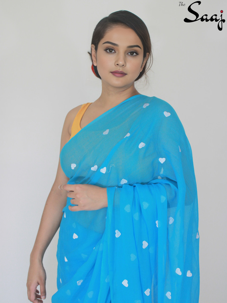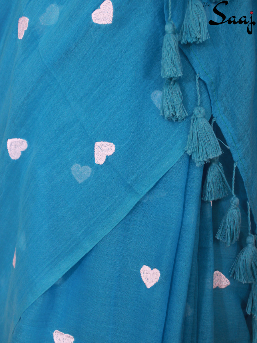 Blue Mohabbat – Heart Embroidered Mul Cotton Saree