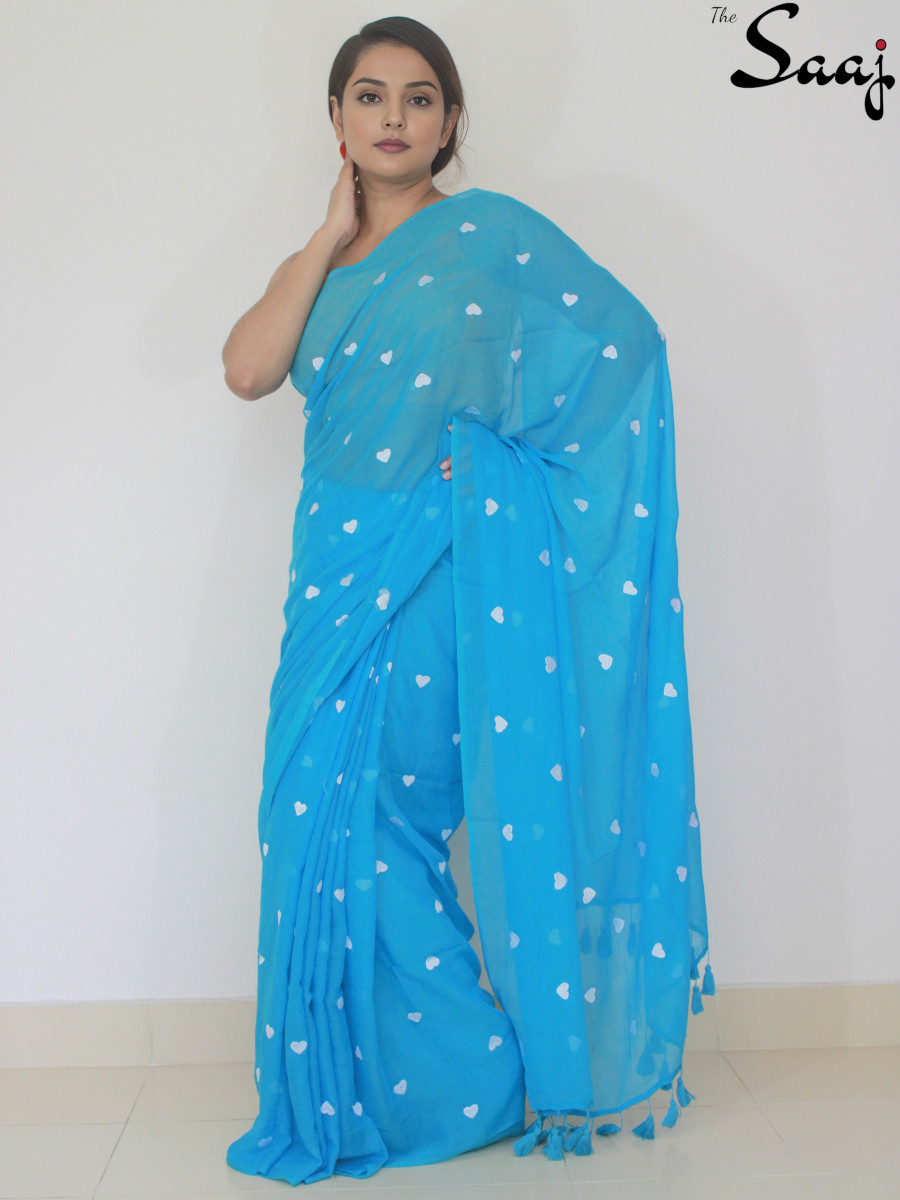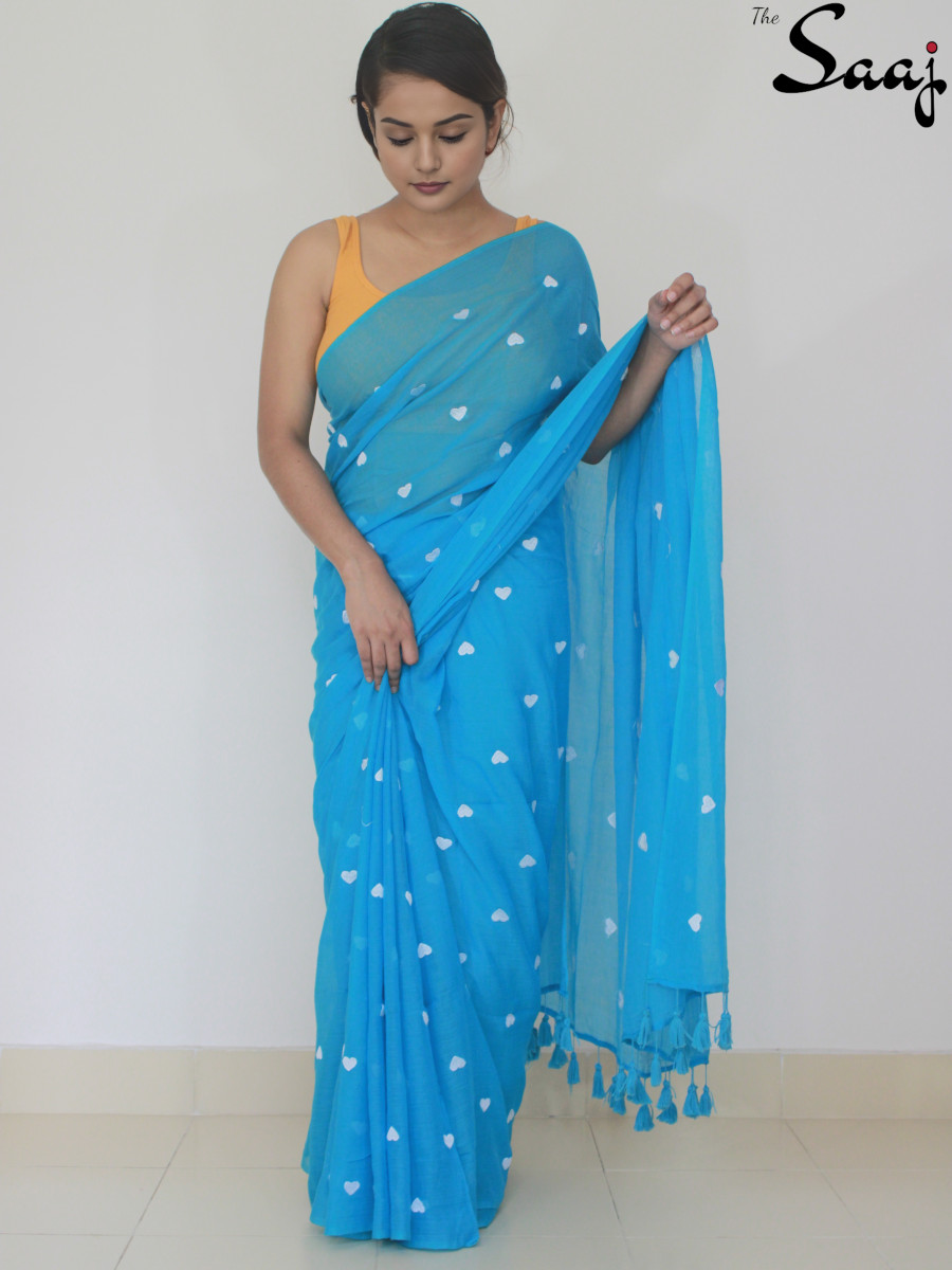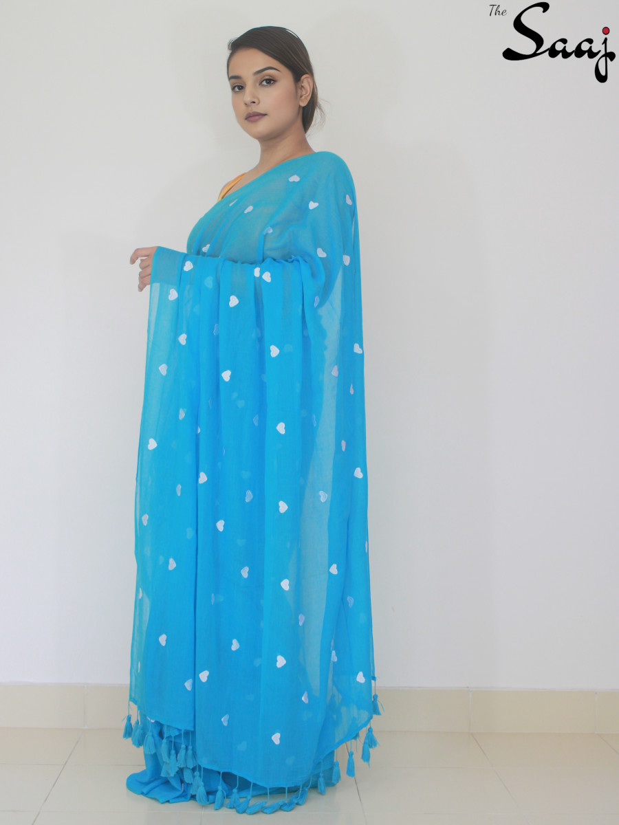 Blue Mohabbat – Heart Embroidered Mul Cotton Saree
