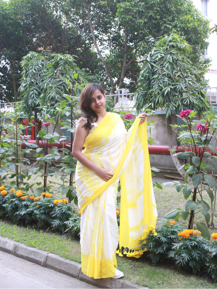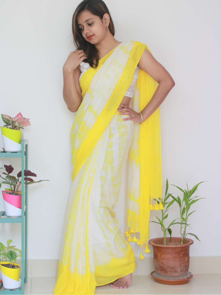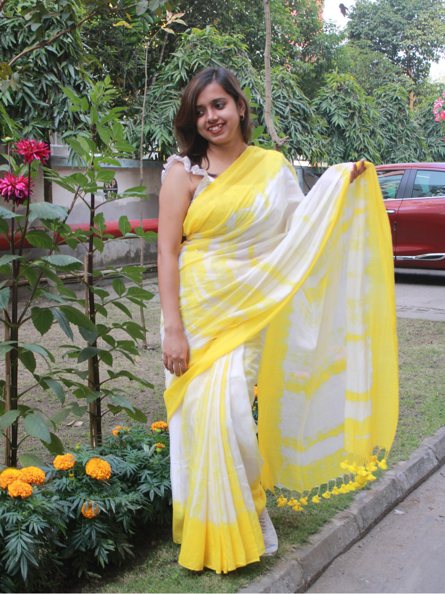 Home Sarees Featherlight Mul Cotton Citrus Burst – Yellow and White Mul Cotton Shibori Dyed Saree