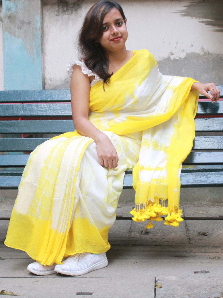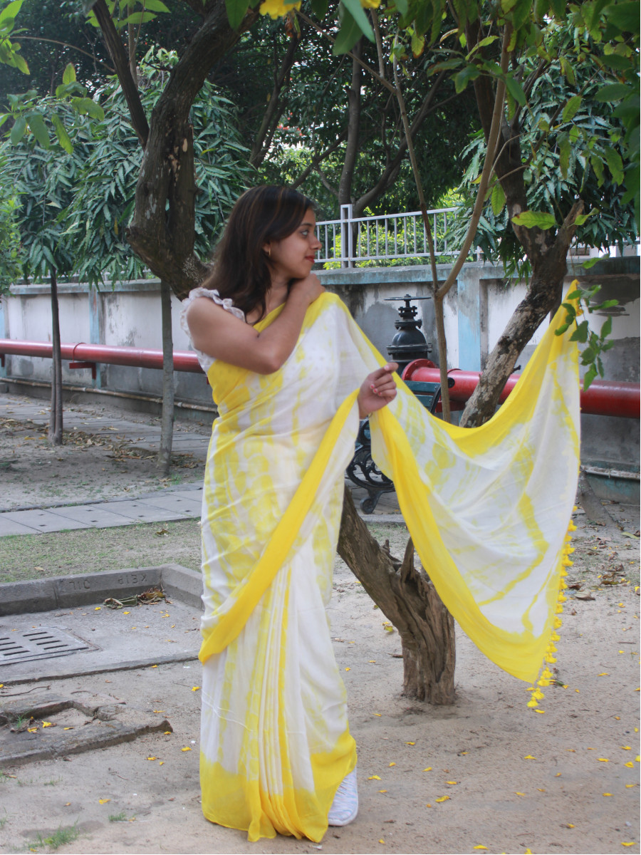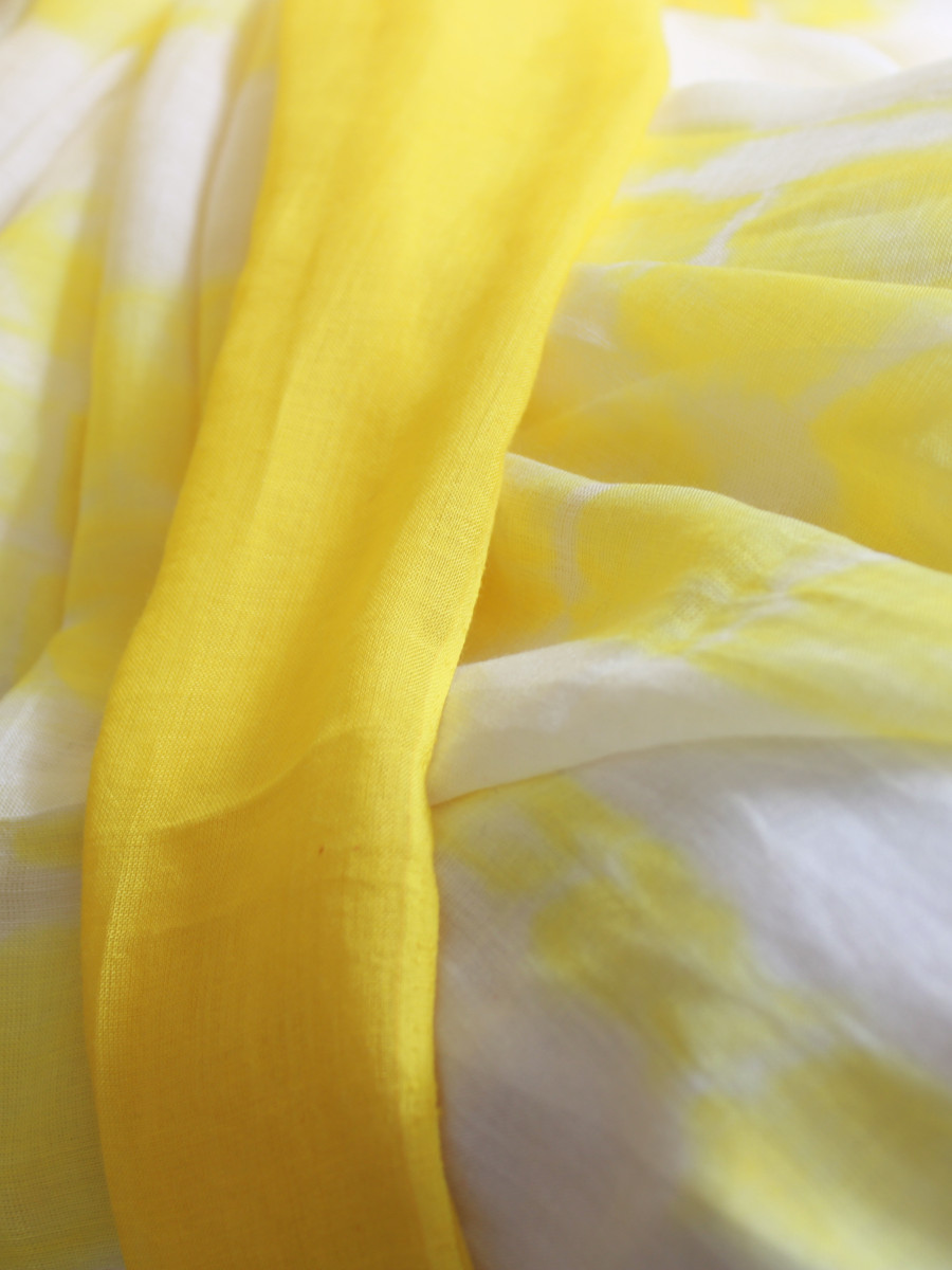 Home Sarees Featherlight Mul Cotton Citrus Burst – Yellow and White Mul Cotton Shibori Dyed Saree