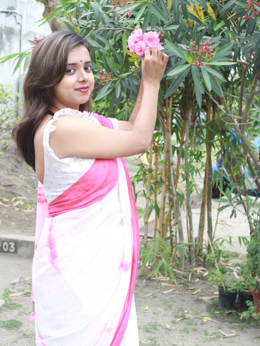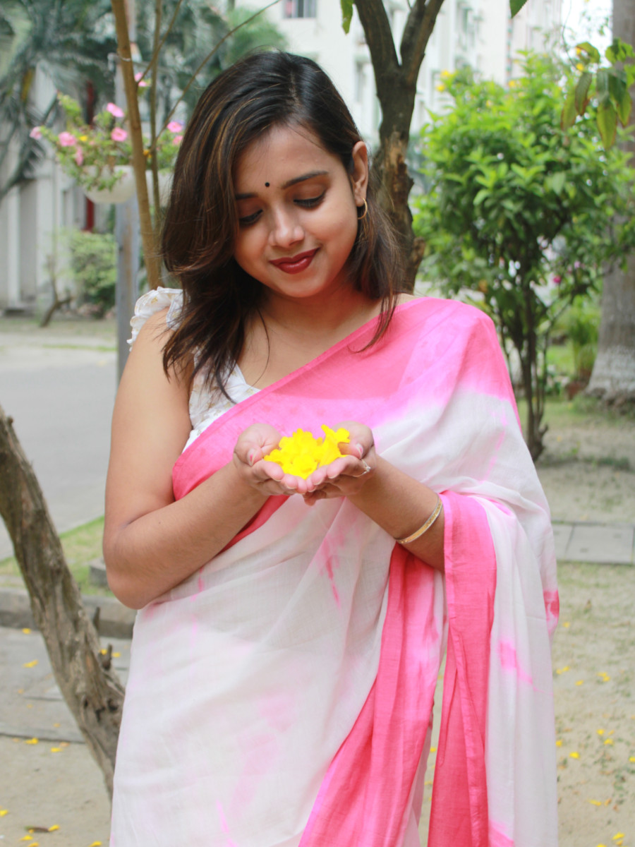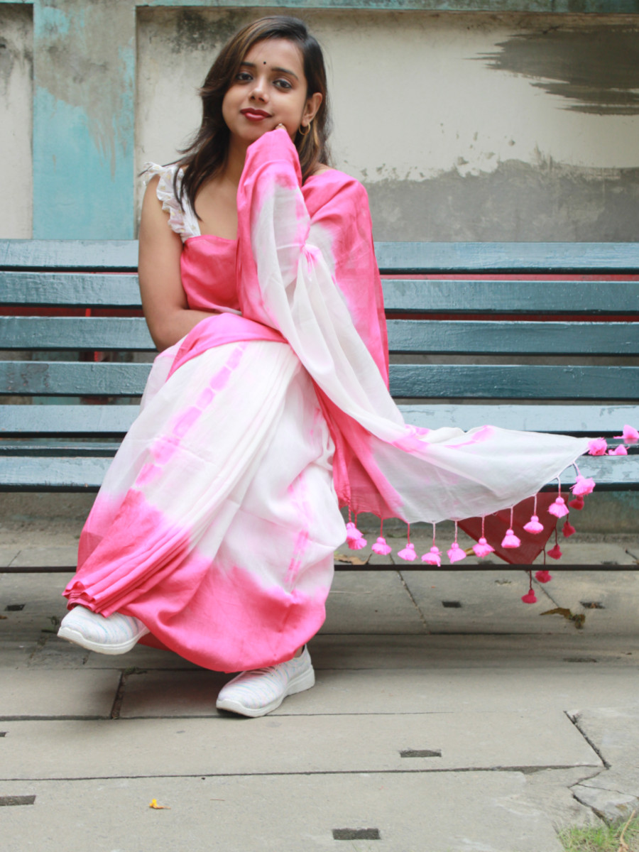 Cotton Candy Dream – White and Pink Mul Cotton Shibori Dyed Saree