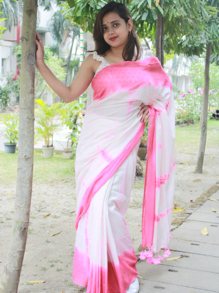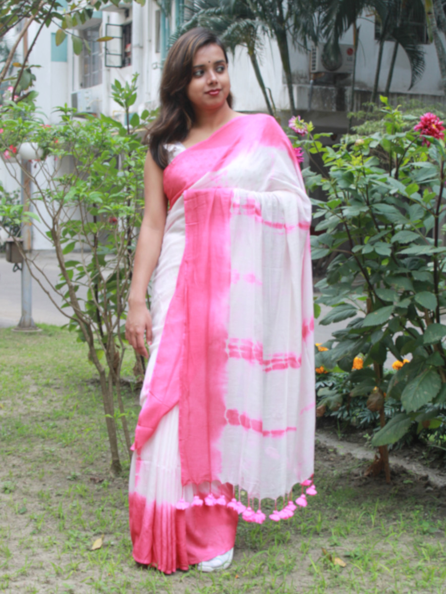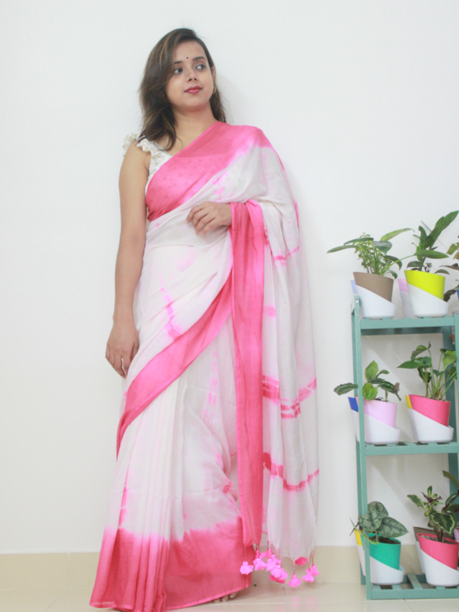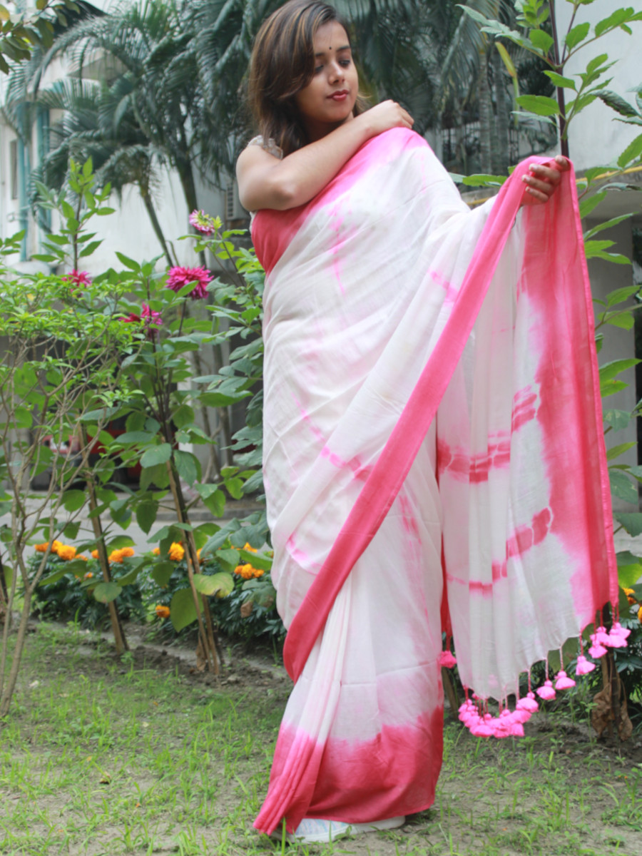 Cotton Candy Dream – White and Pink Mul Cotton Shibori Dyed Saree