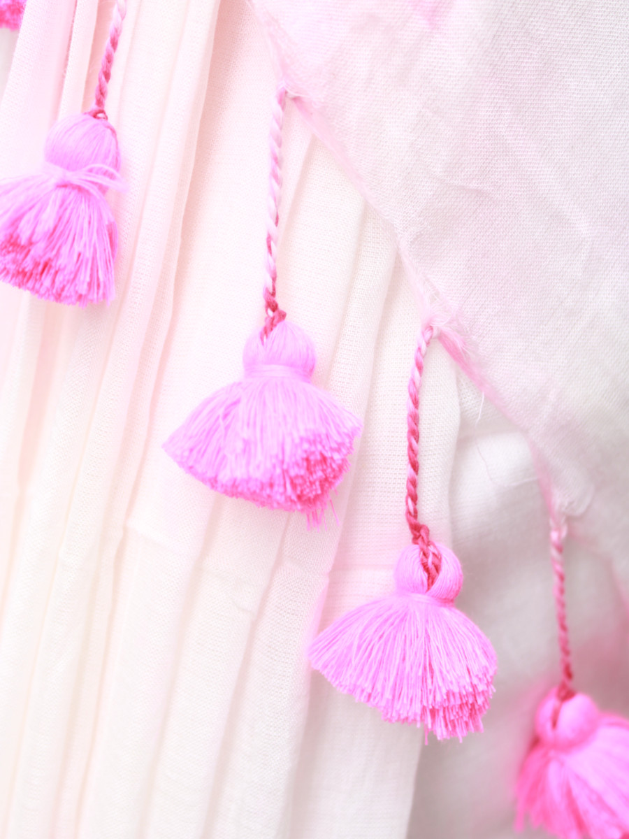 “Cotton Candy Dream” embraces you with the same softness as sweet cotton candy blends in mouth. This White and Pink Mul Cotton Shibori Dyed Saree makes you feel happy and brings back the same ease and comfort of your childhood days. Delicate pink hues on white base makes you look like a fairy of your dream; the pink tassels chimes harmony; all over makes your dream come true.