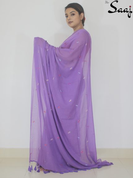 Purple Meadow – Dragonfly Embroidered Mul Cotton Saree