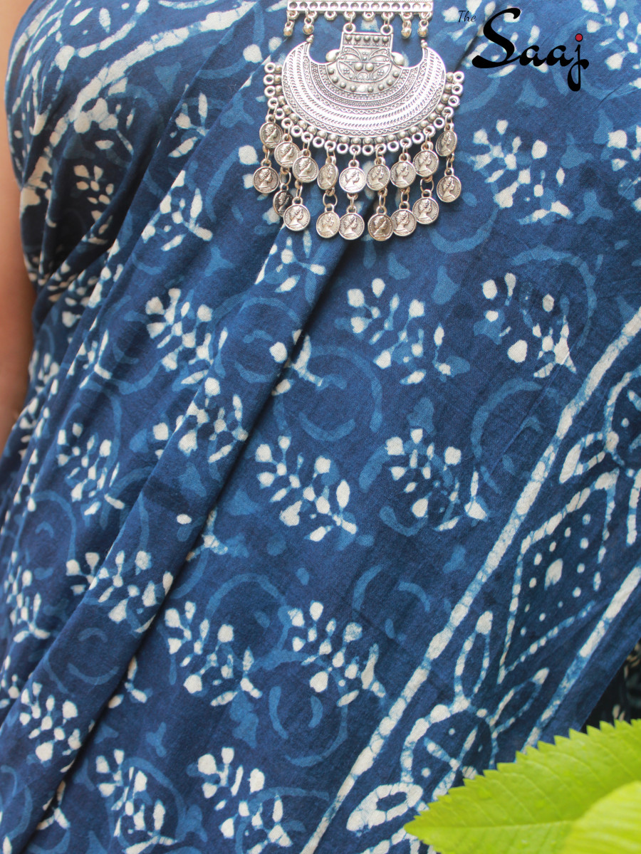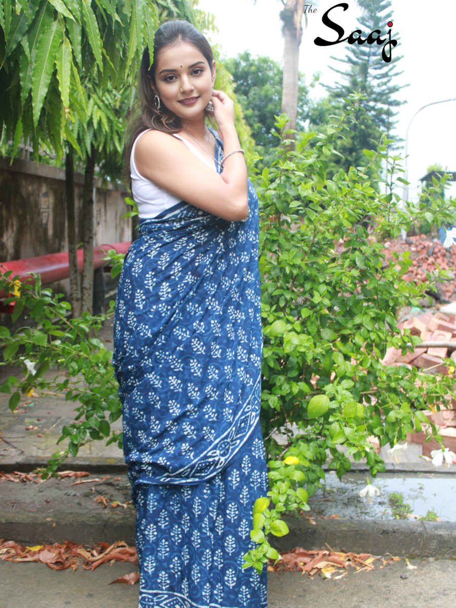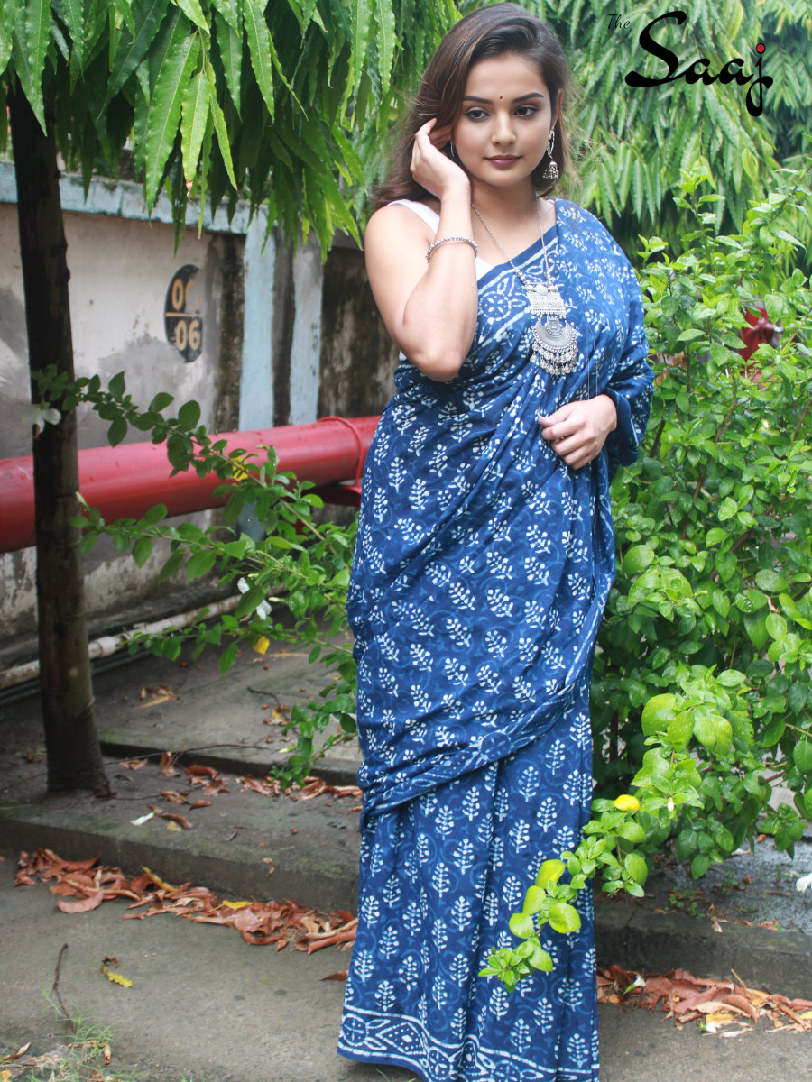 Home Sarees Hand Blockprint Diya – Indigo Hand Block Print Cotton Saree
