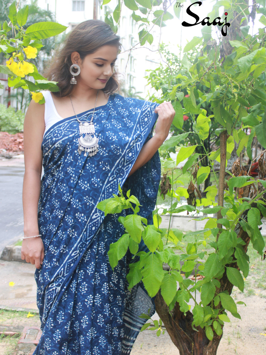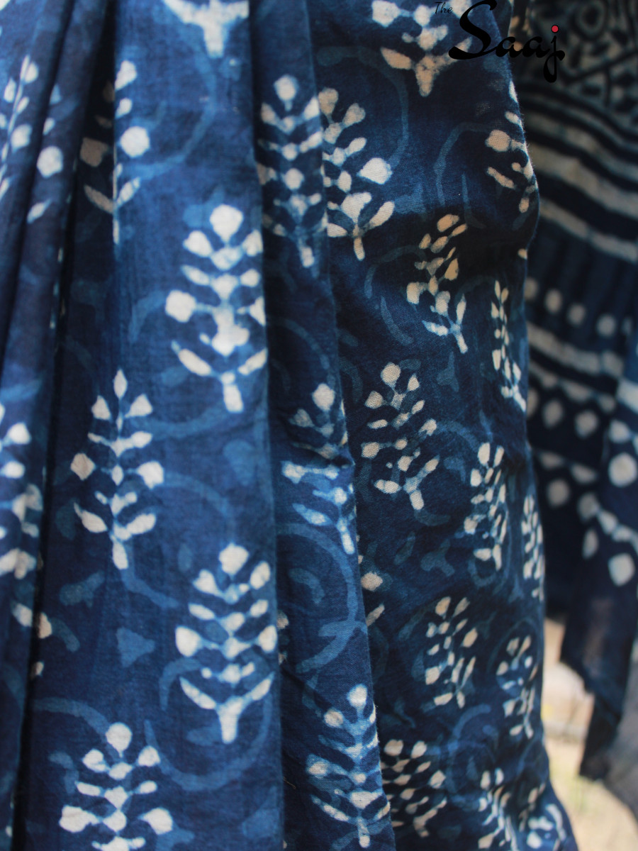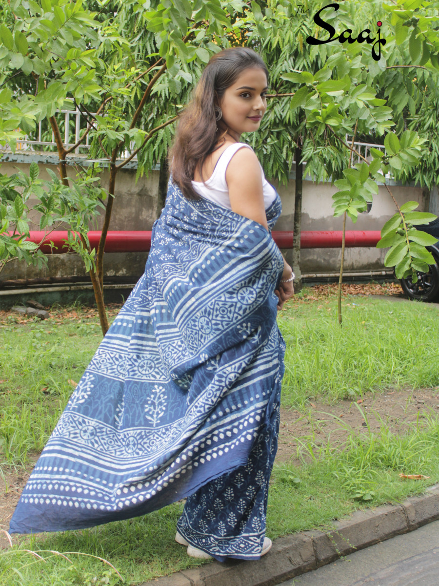 Home Sarees Hand Blockprint Diya – Indigo Hand Block Print Cotton Saree
