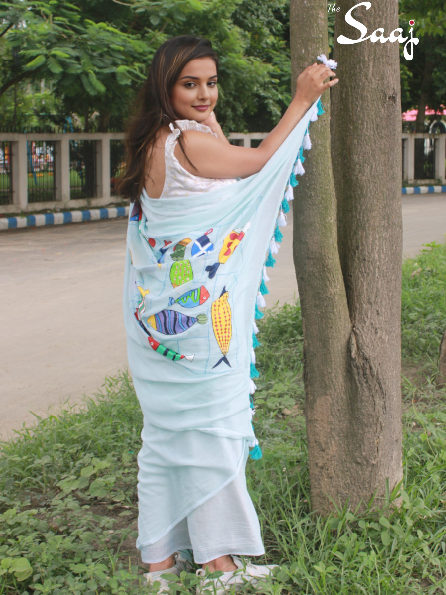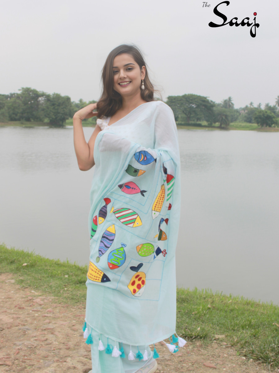 Home Sarees Cotton Sarees Fishy Affair – Hand Painted and Hand Embroidered Mul Cotton Saree