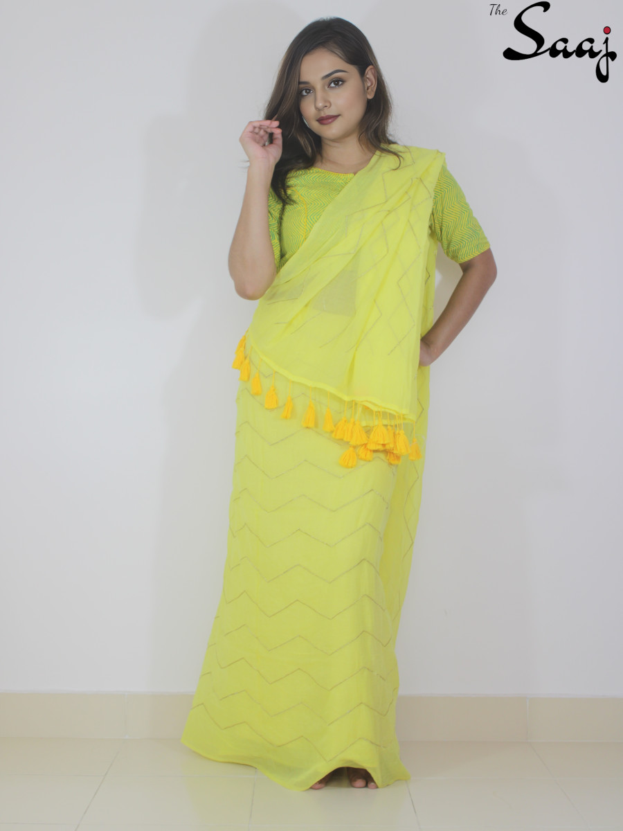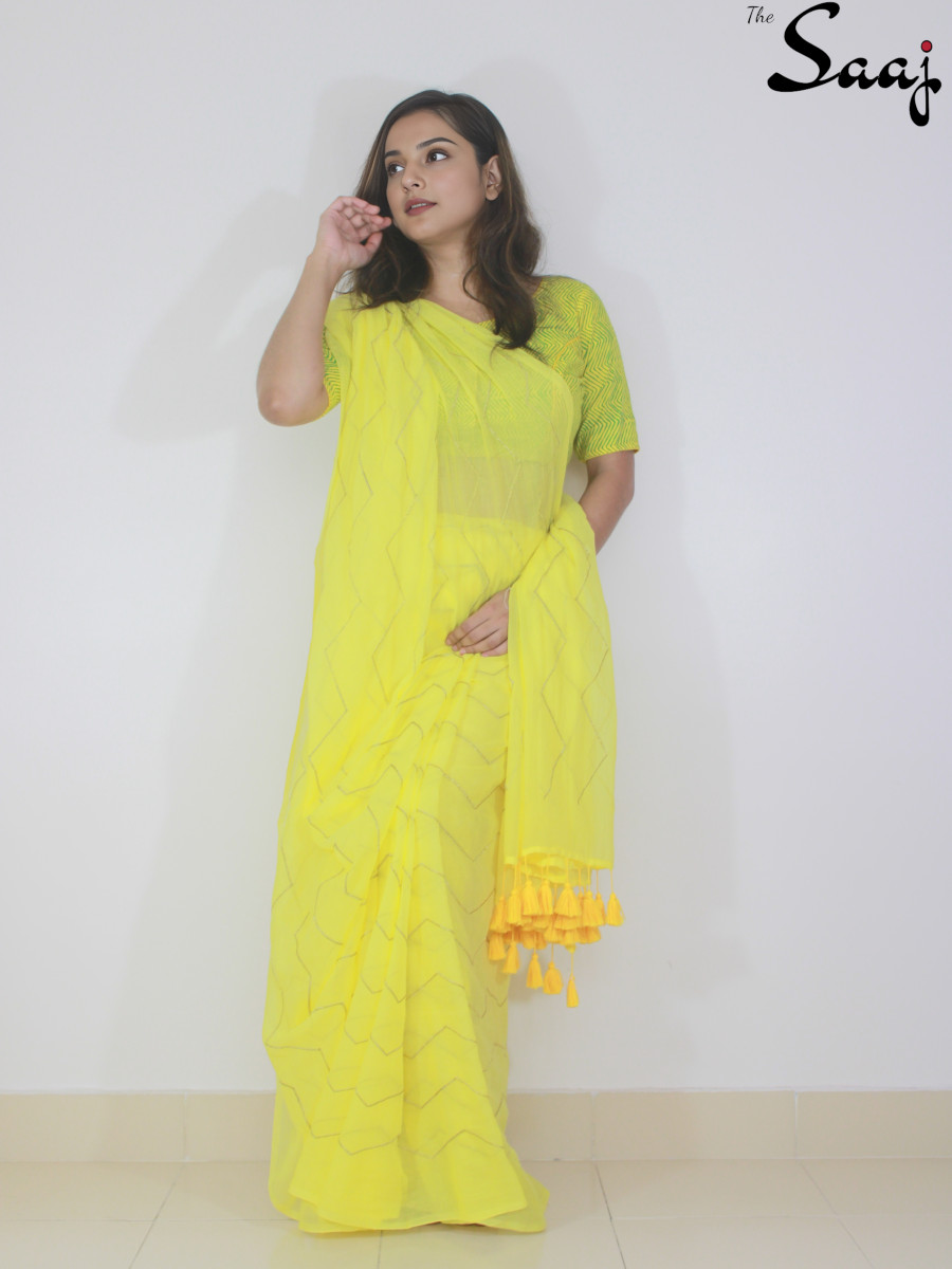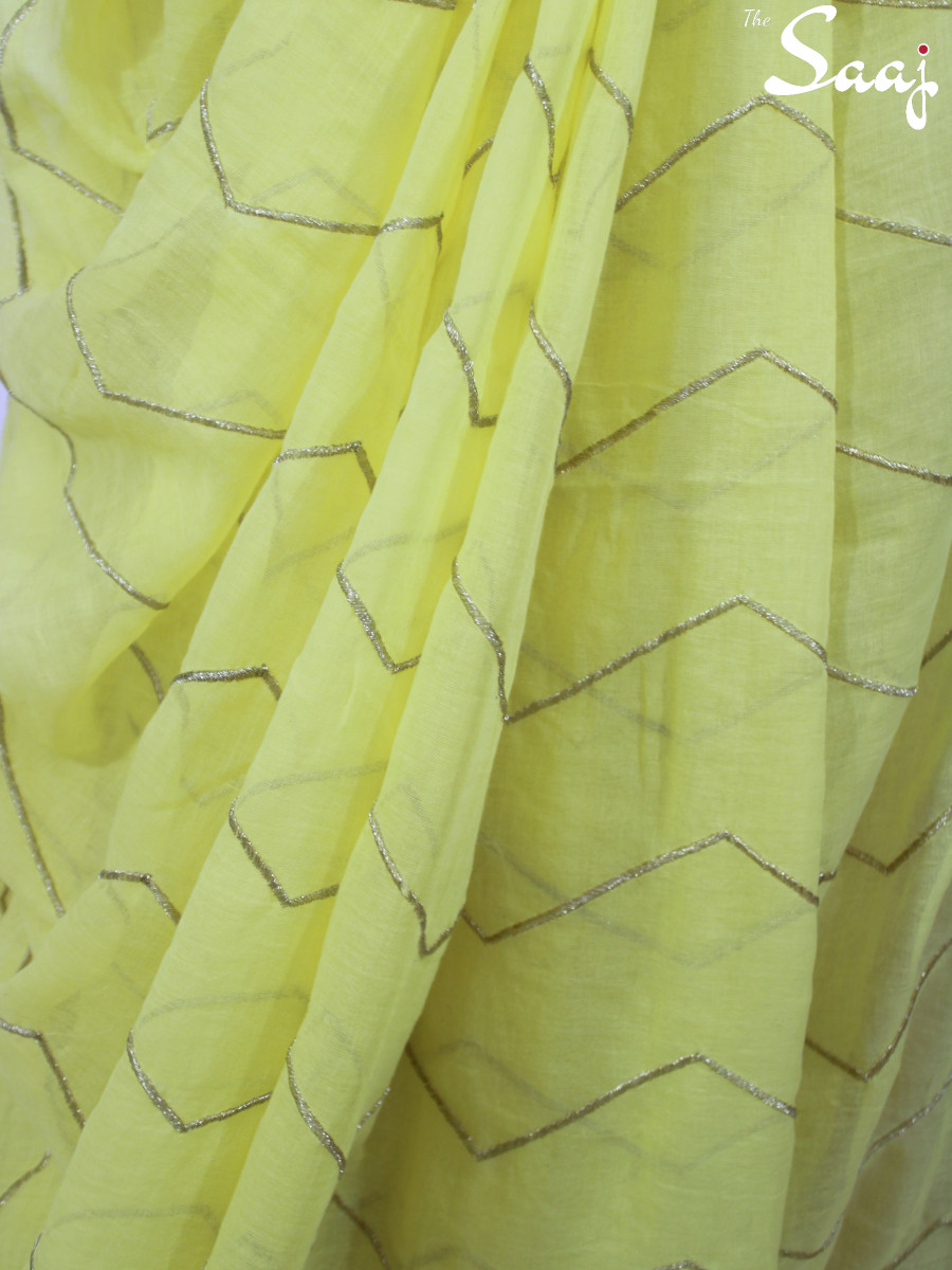 Lemon Lush – Yellow Mul cotton Zigzag Zari Hand Embroidered Saree