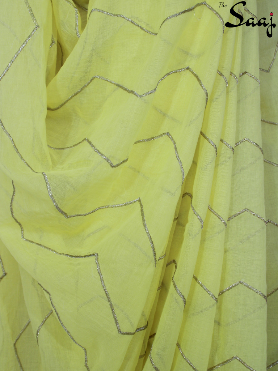 Home Sarees Featherlight Mul Cotton Lemon Lush – Yellow Mul cotton Zigzag Zari Hand Embroidered Saree