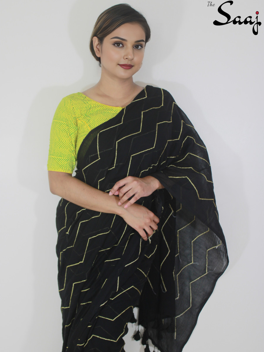 ‘Noir‘ means Black in French. Our Noir Delight – Black Mul Cotton Zigzag Hand Embroidery Saree is crafted from premium mul cotton to make you feel lightweight and breathable. The intricate hand-embroidered zigzag patterns woven in high quality zari thread add a unique touch in the black hue. Playful black tassels at the end of the pallu makes you feel charming. Either pair it with a black and white blouse for your daily chore or  give it a festive look pairing with a bright red or golden blouse. Elevate your wardrobe with this luxurious piece.