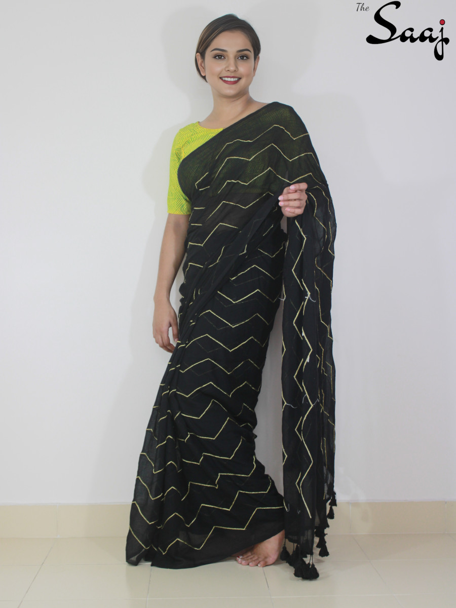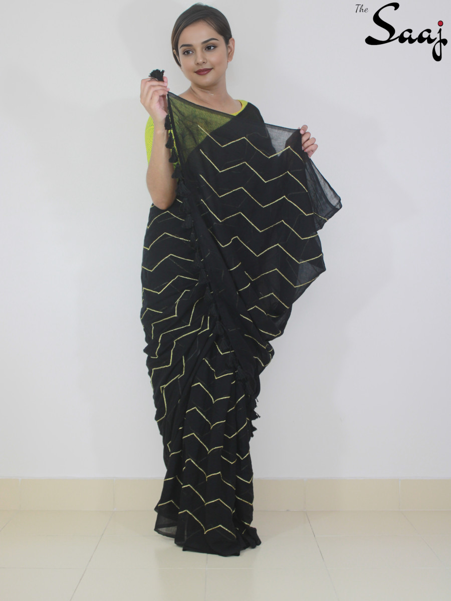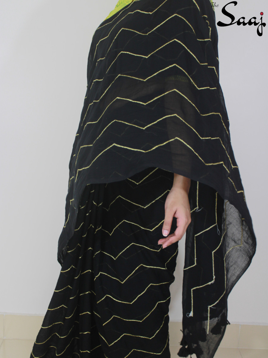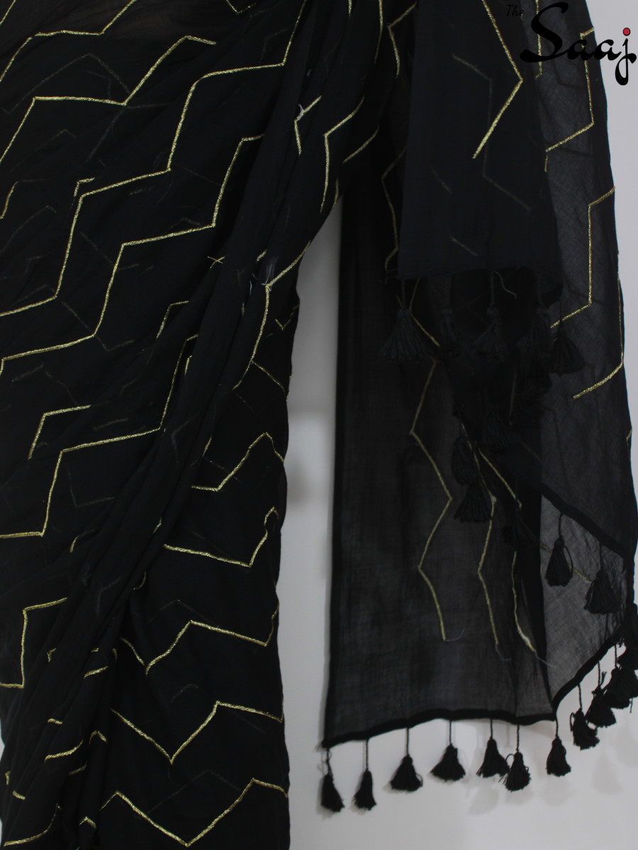 Noir Delight- Black Mul Cotton Zigzag Zari Hand Embroidery Saree