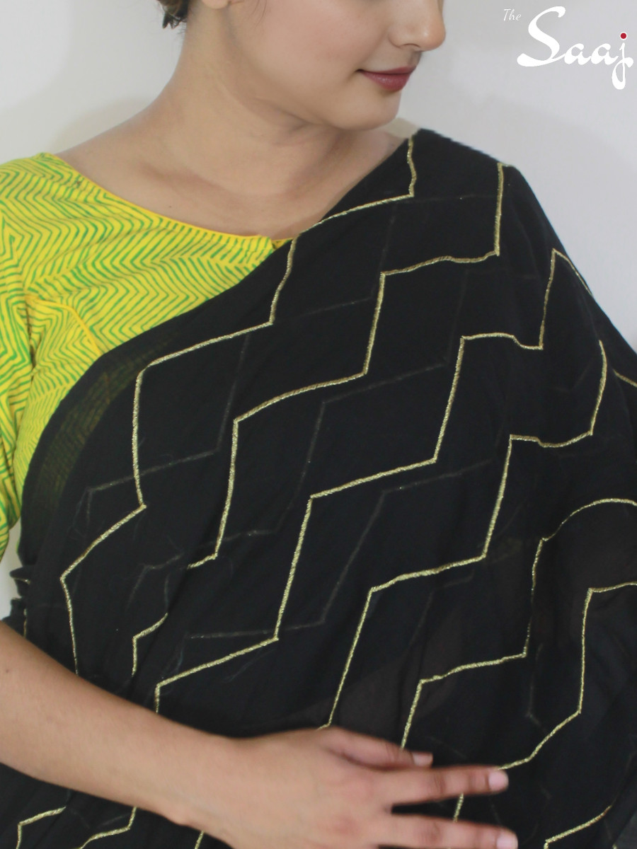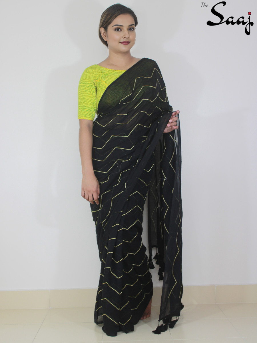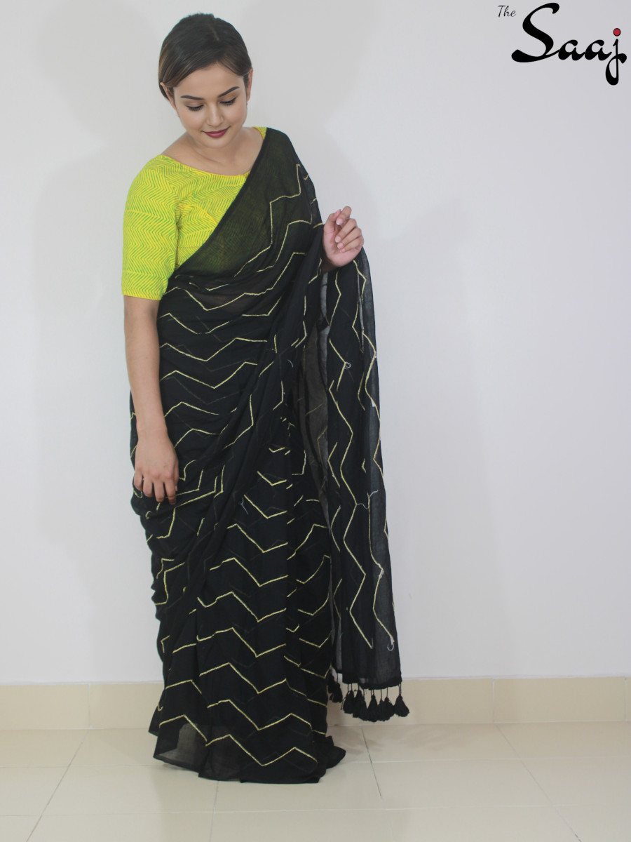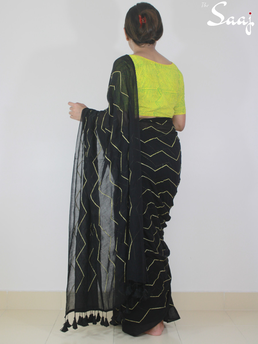 Noir Delight- Black Mul Cotton Zigzag Zari Hand Embroidery Saree