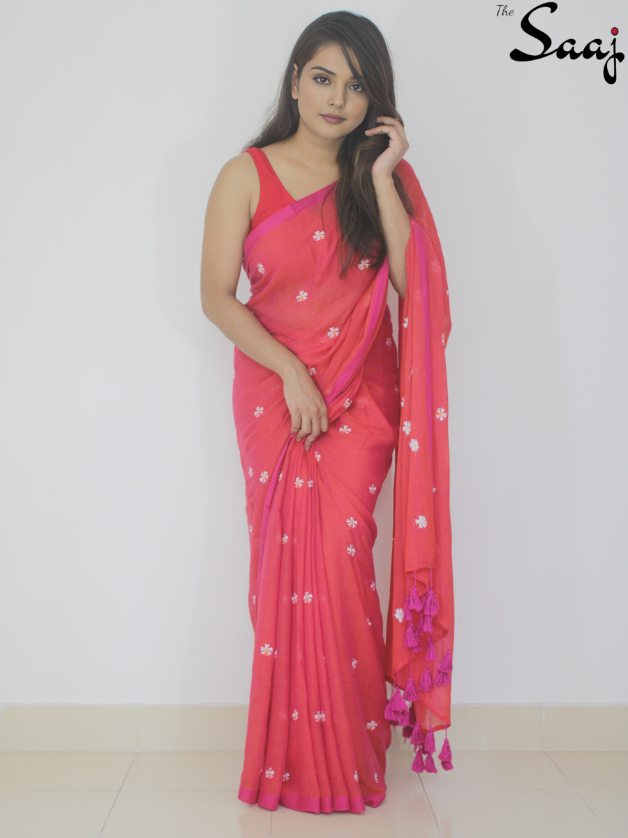 Be the first to review “Parijat Blaze – Embroidered Red Orange Dual Tone Mul Cotton Saree” Cancel reply