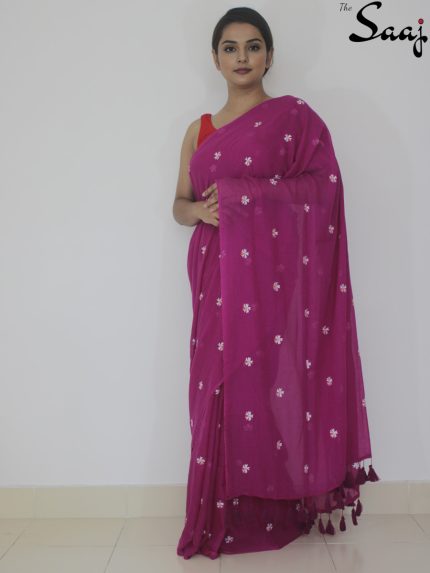 Midnight Blossom – Shiuli Flower Embroidered Magenta Mul Cotton Saree