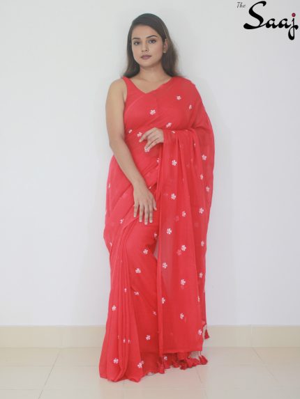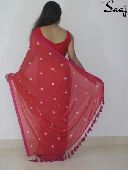 Scarlet Shiuli – Flower Embroidered Red Mul Cotton Saree