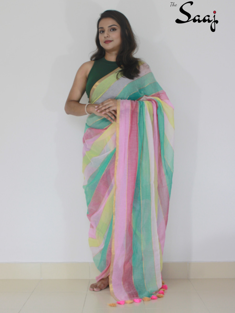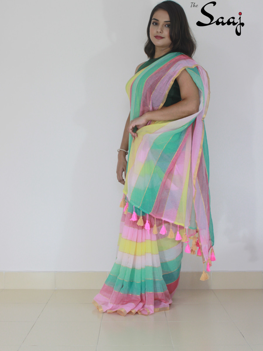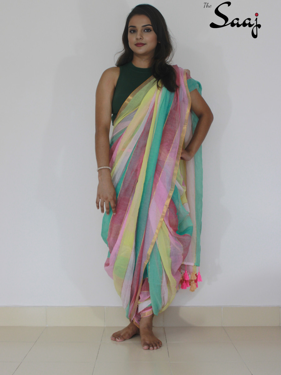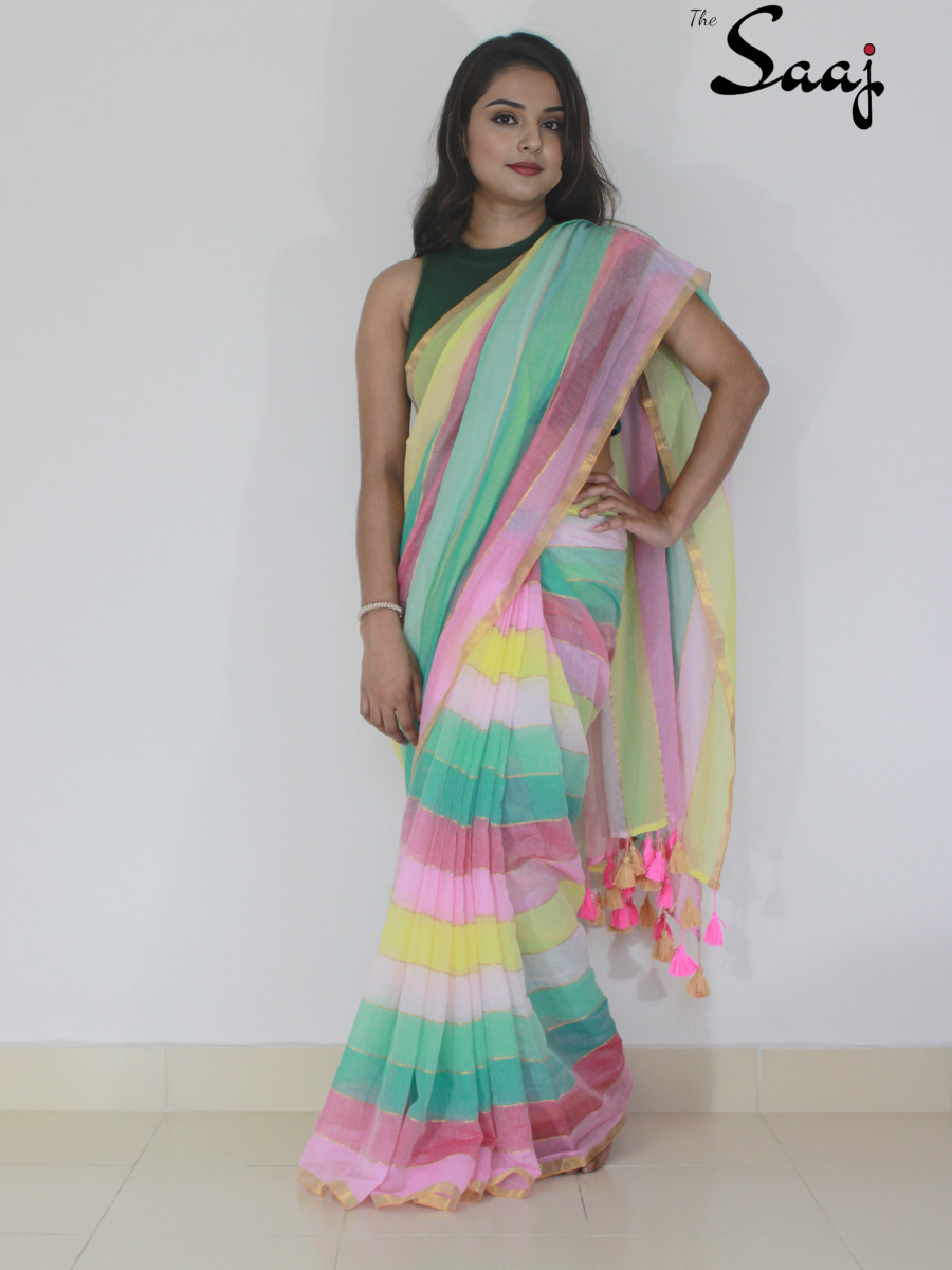 Shades of pink, green and yellow combines with each other so seamlessly that this saree tells a story of it’s own. Every colour is highlighted with golden zari weaving which makes it’s look more appealing. It’s a perfect choice for your daytime outing. Mul cotton fabric is so soft and soothing that you will feel relaxed and enjoy completely.