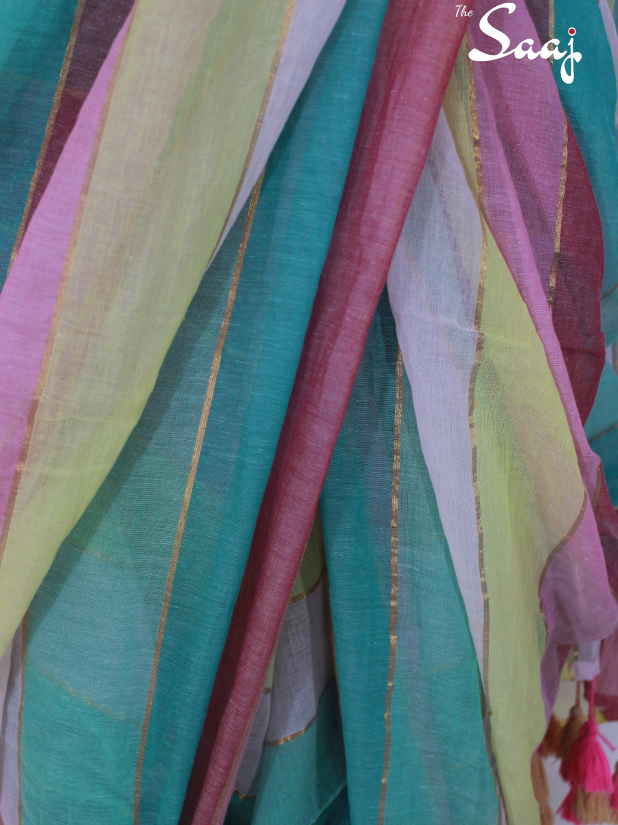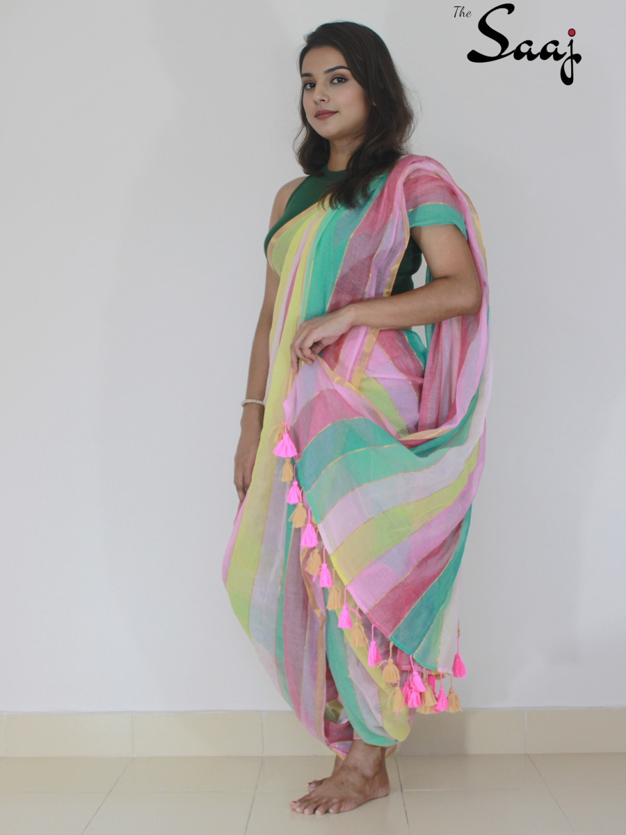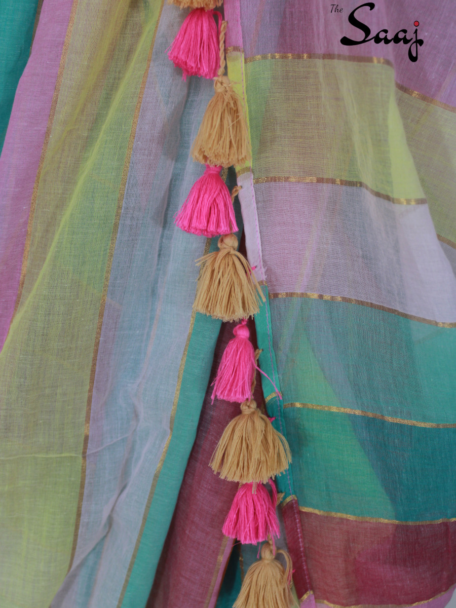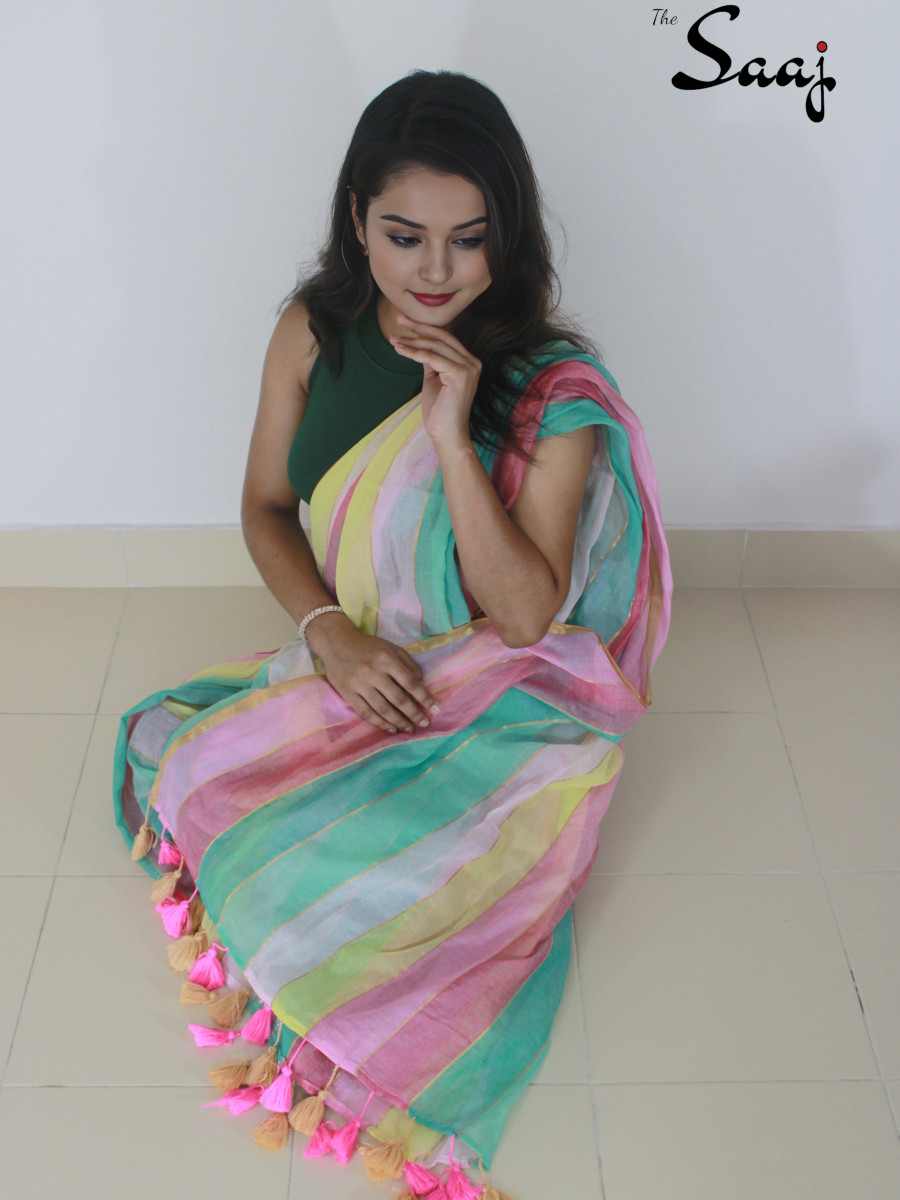 Shades of pink, green and yellow combines with each other so seamlessly that this saree tells a story of it’s own. Every colour is highlighted with golden zari weaving which makes it’s look more appealing. It’s a perfect choice for your daytime outing. Mul cotton fabric is so soft and soothing that you will feel relaxed and enjoy completely.