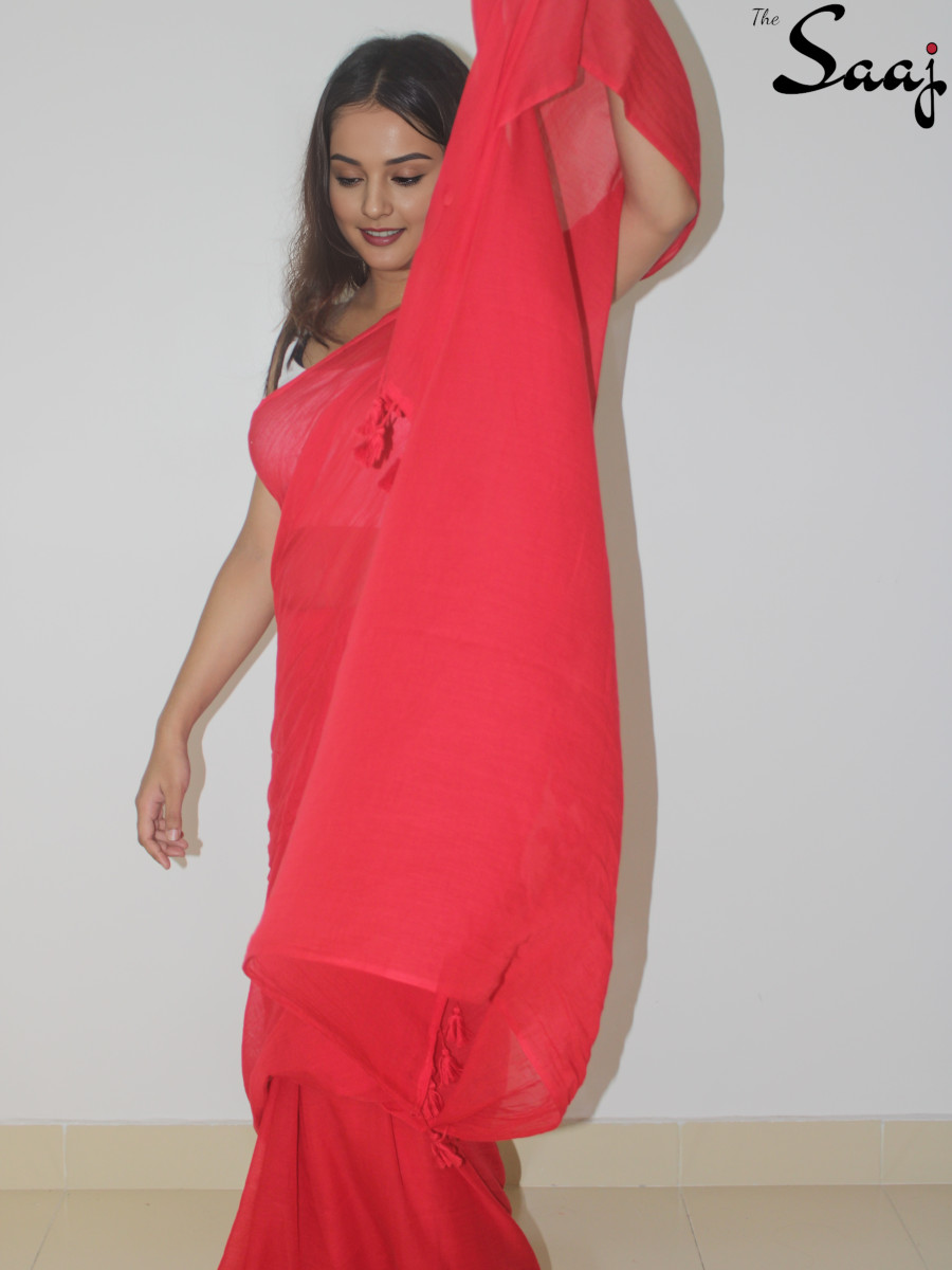 Ruby comes from Latin word ruber that means red. Our “Ruby” saree comes in bold red colour. It looks stunning in its own. Red tassels at the pallu adds an extra charm to the soft, breathable mul cotton. It is super easy to drape and carry along.
