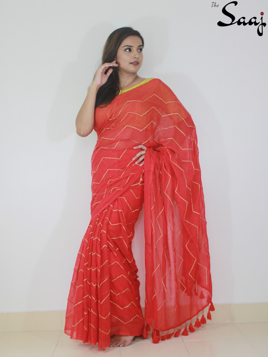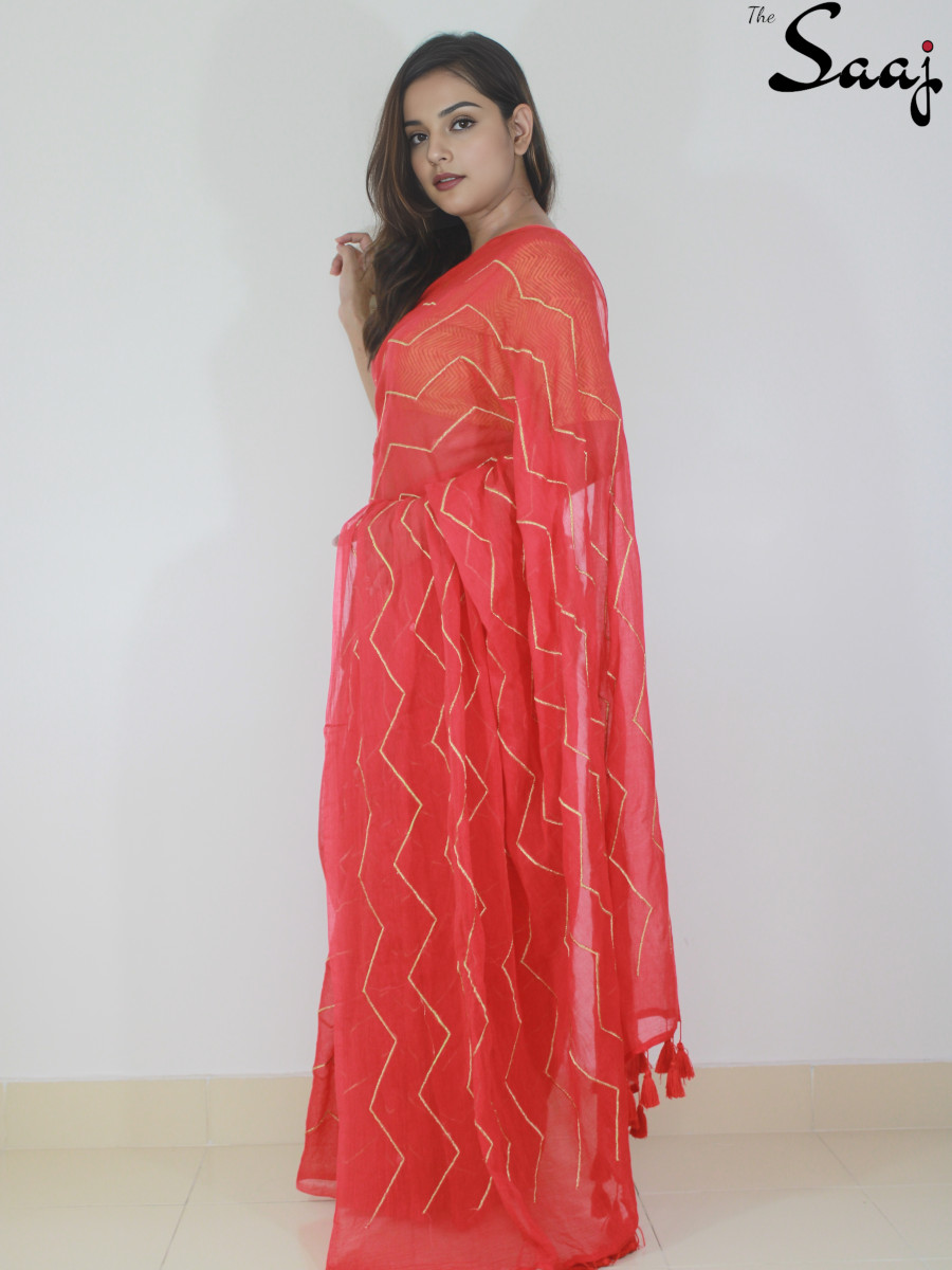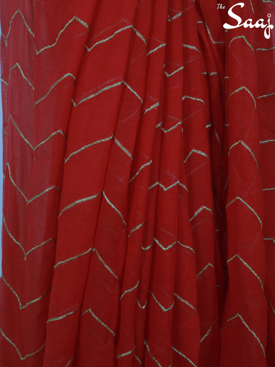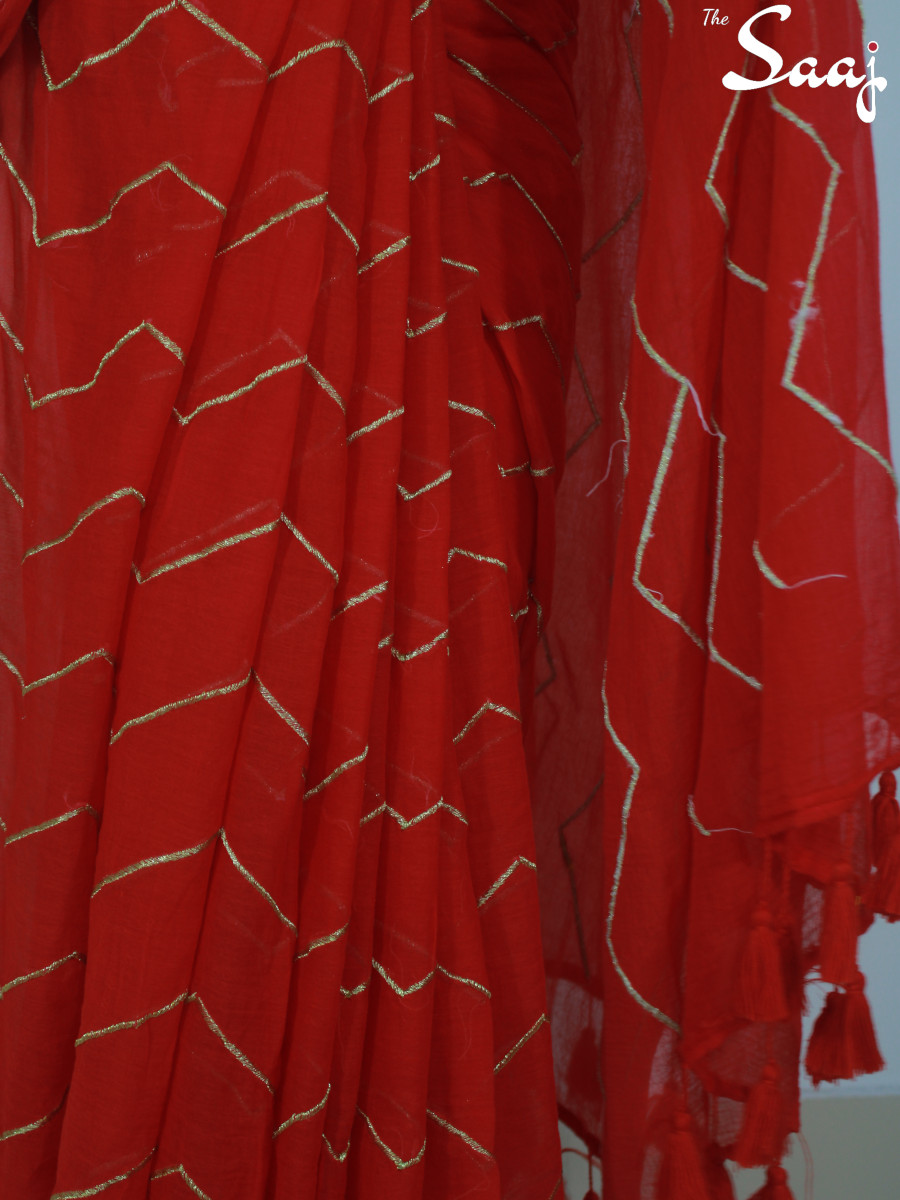 Scarlet Allure – Red Mul cotton Zigzag Zari Hand Embroidered Saree