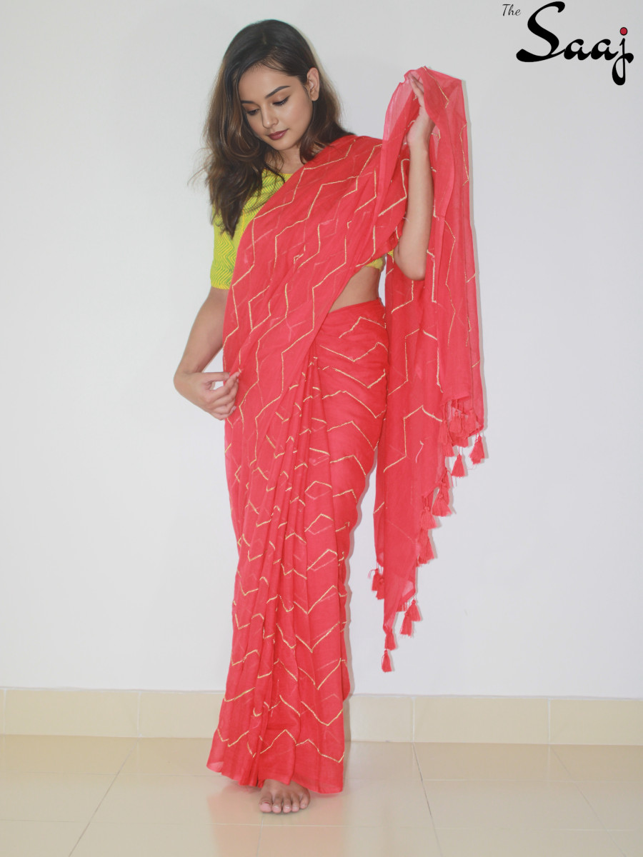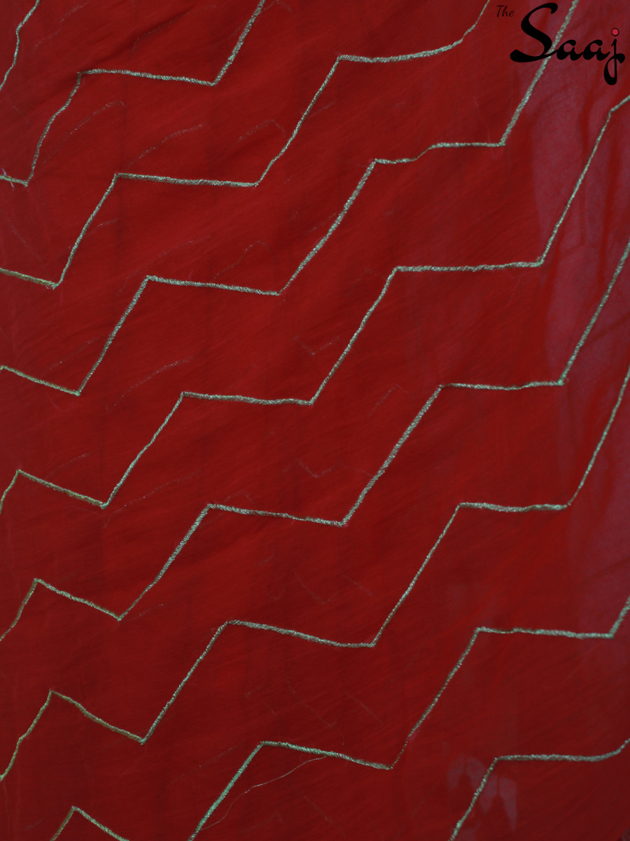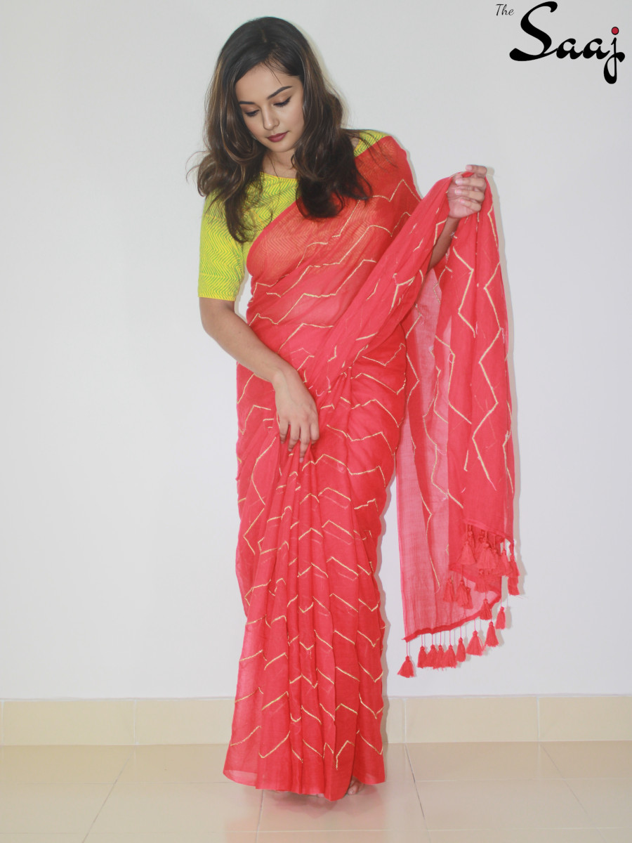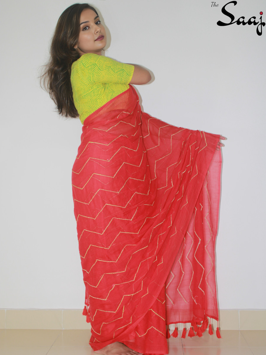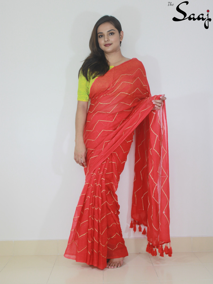 Scarlet Allure – Red Mul cotton Zigzag Zari Hand Embroidered Saree