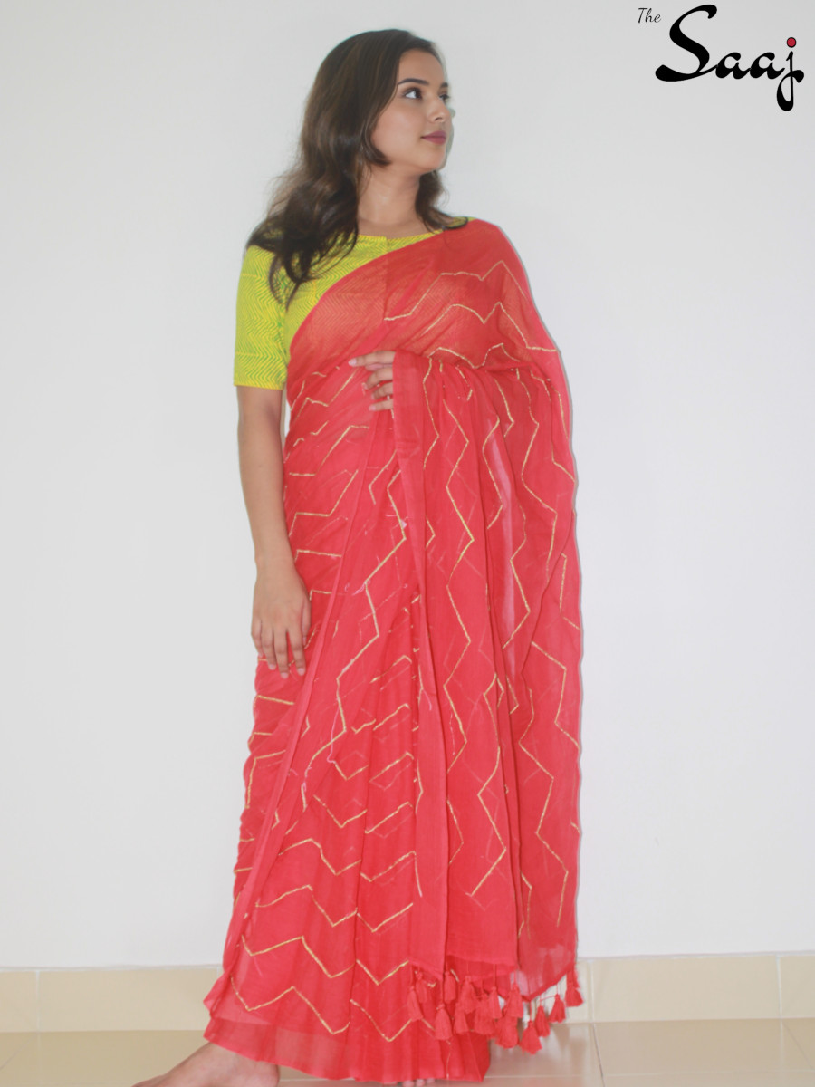 Scarlet, a bright orangish red color is a symbol of power. First documentation of scarlet colour dyes were in the 8th century B.C. In Rome it was second in royal colour status in the robes of Emperors. We are sure that our “Scarlet Allure” will give you the same feeling of power and authority in your life besides making you look exquisite. This premium quality mul cotton saree can be draped effortlessly and in versatile manner. Golden embroidery and red tassels on pallu unleash your grace and poise and gives you ultimate comfort. Add this unique piece of six yards drape to your wardrobe and get ready to slay in any occasion.
