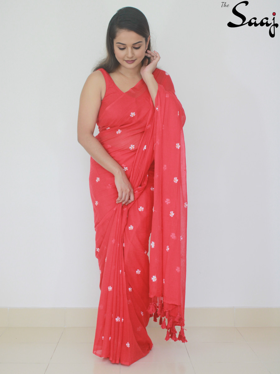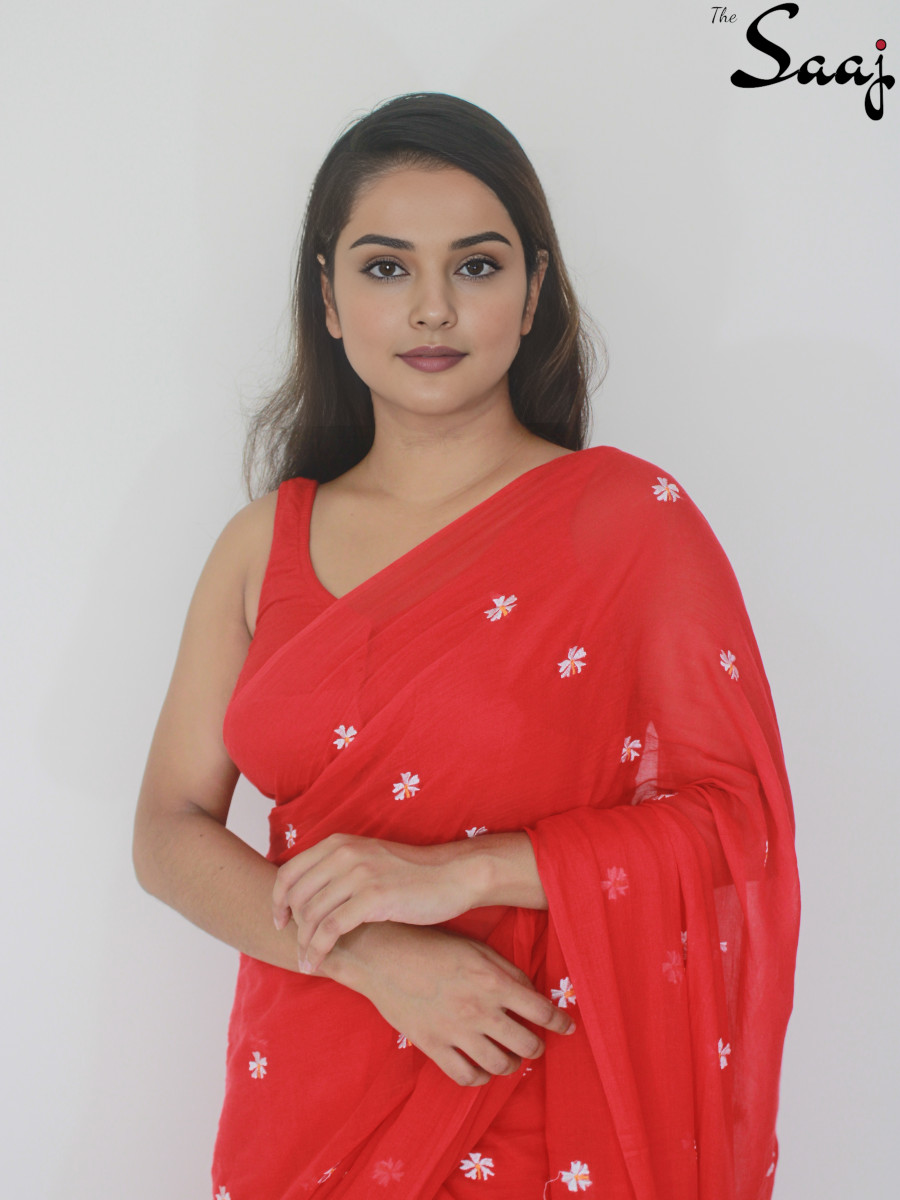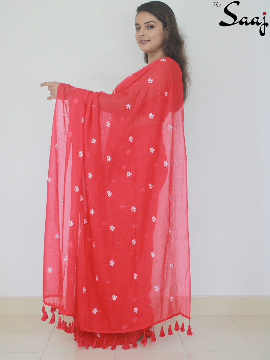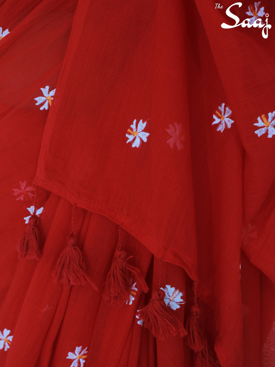 Scarlet Shiuli – Flower Embroidered Red Mul Cotton Saree