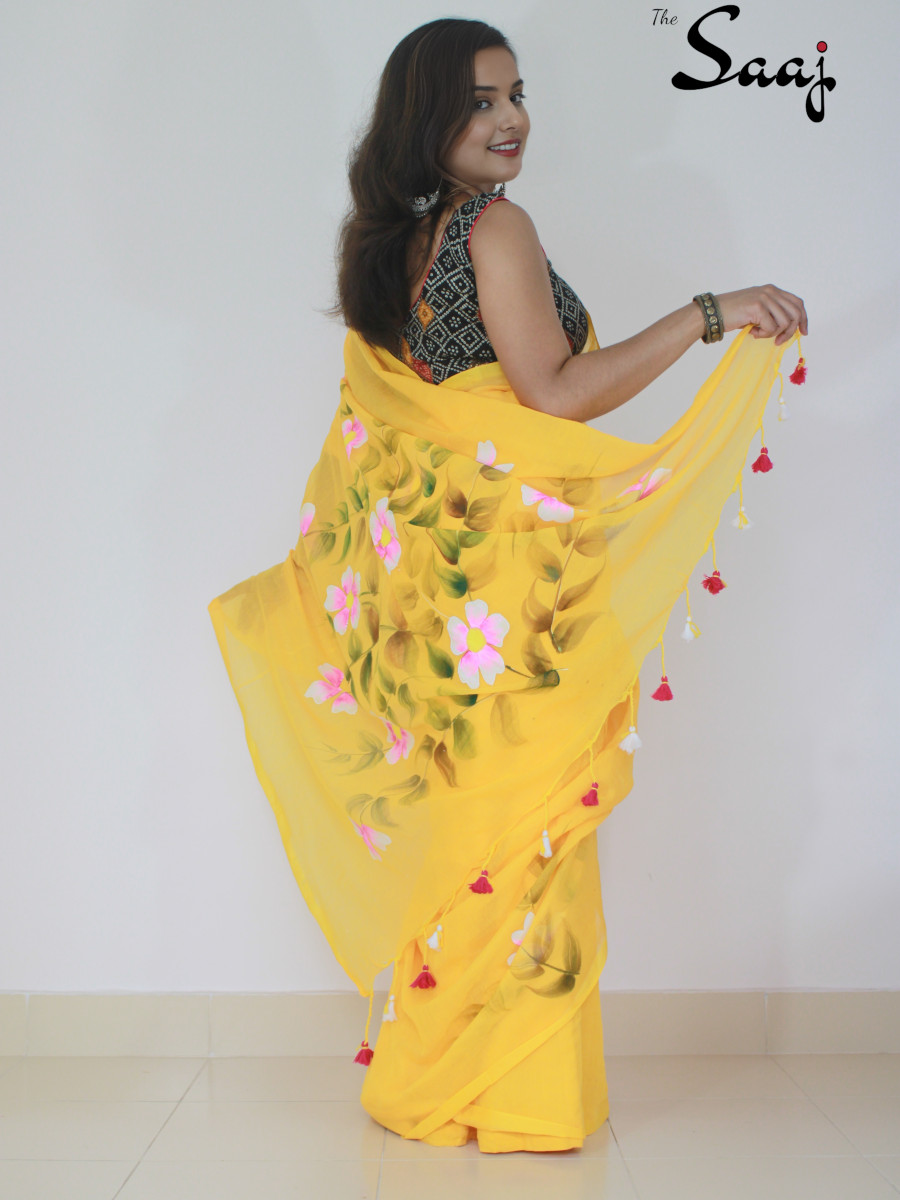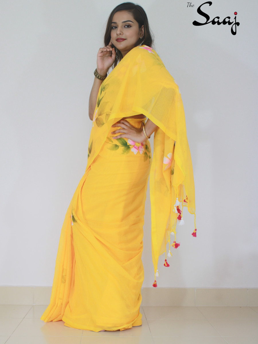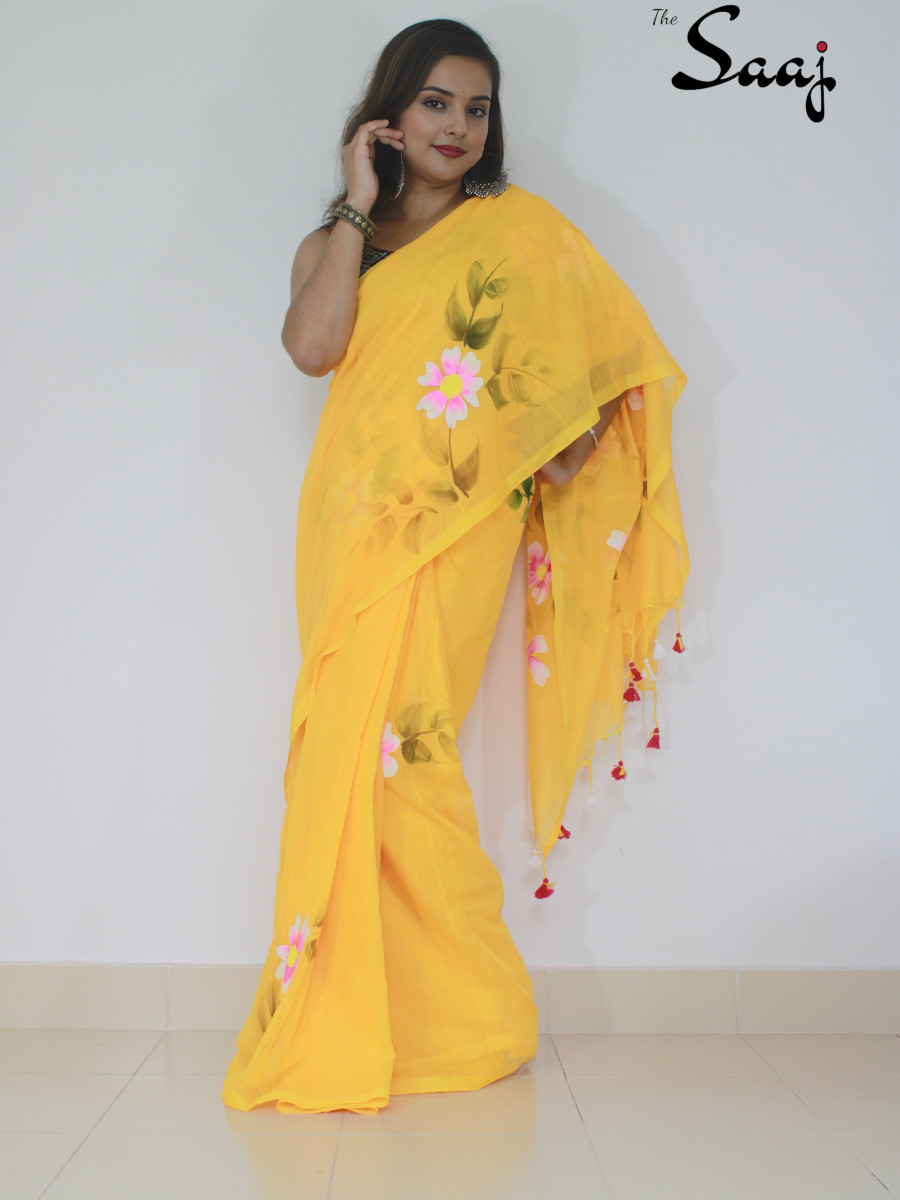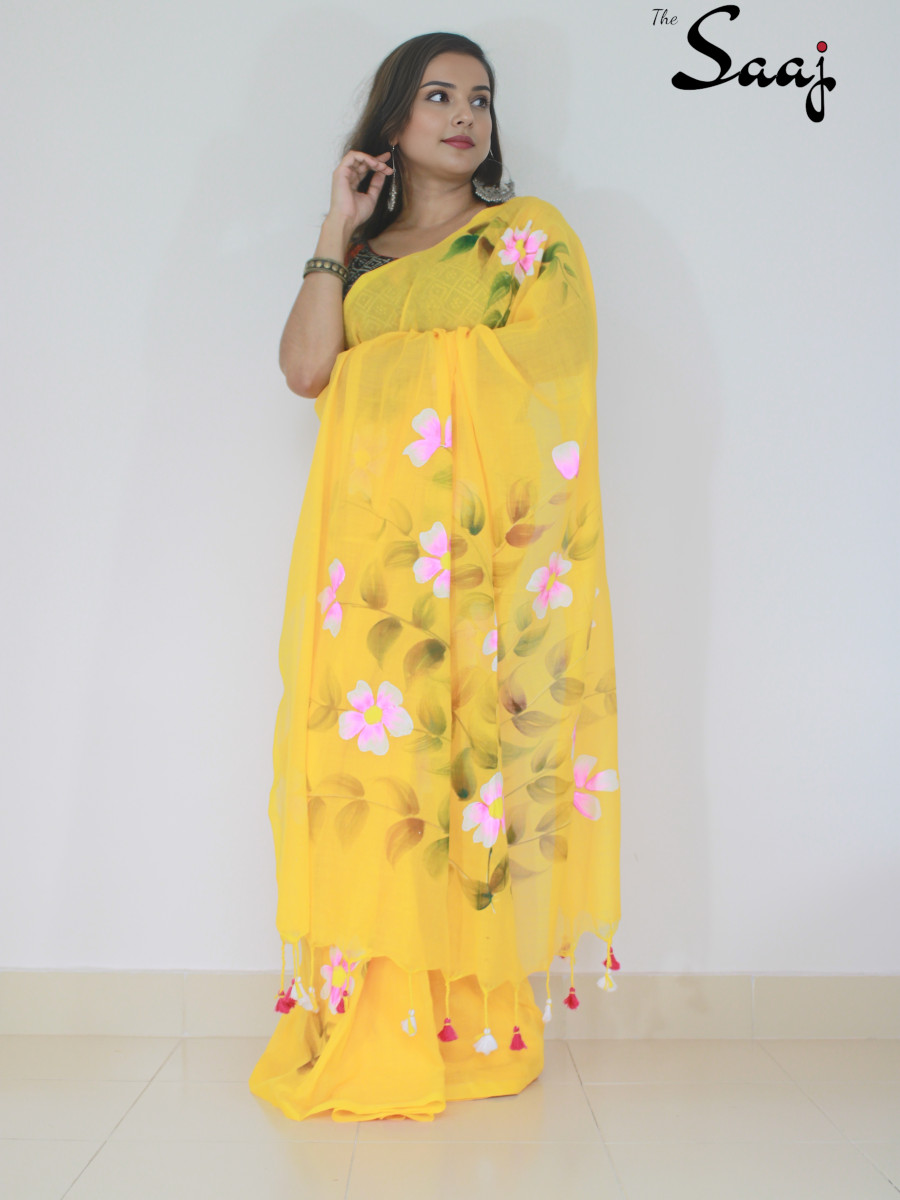 The Yellow Garden – Handpainted Yellow Mul Cotton Saree
